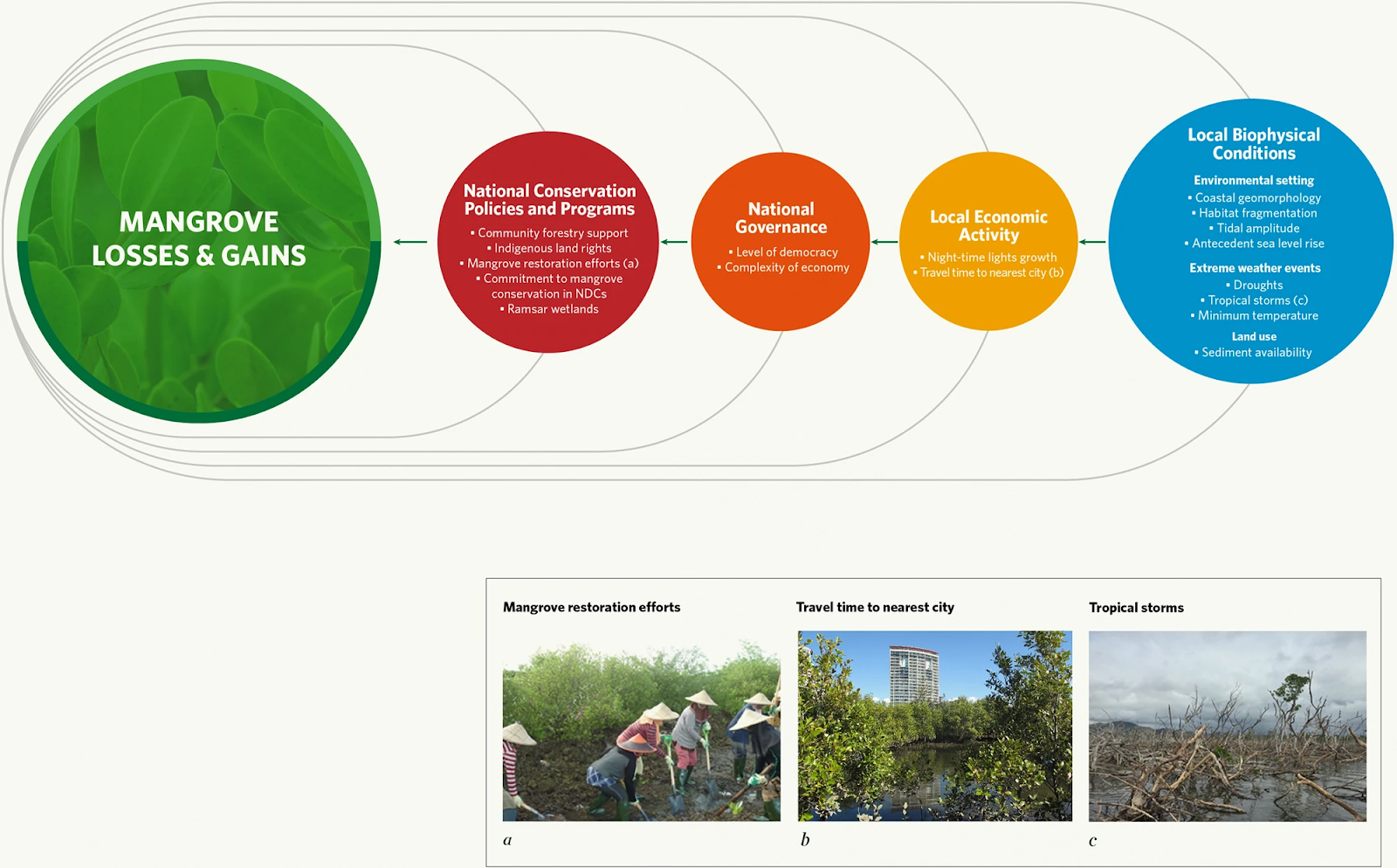 Factors in our analyses were local biophysical conditions (blue) and socioeconomic variables (yellow) and national socioeconomic variables (orange and red). Examples of mangrove gain can be due to restoration of mangroves by tidal channel recreation in South Sulawesi, Indonesia (a), whereas loss can be due to development pressure close to cities in Gold Coast, Australia (b) and mortality of mangroves by a tropical storm in Yacuna, Fiji (c). Image credits: Rio Ahmad (a), Valerie Hagger (b), Clint Cameron (c).