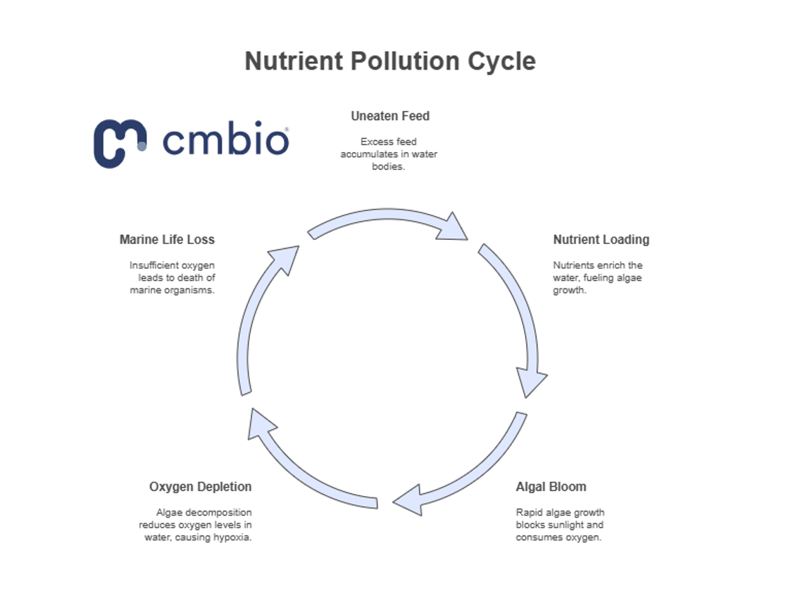 Uneaten feed and fish excrement release high levels of nitrogen and phosphorus, fuelling algal blooms, oxygen depletion, and biodiversity loss.